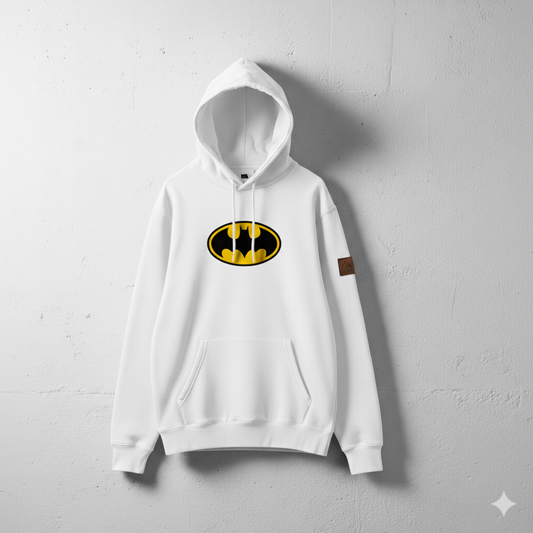 Embrace iconic style with this striking white hoodie, featuring the legendary Batman logo prominently displayed on the chest. Crafted for comfort and designed for impact, this hoodie is a bold statement piece for any fan of the Dark Knight.